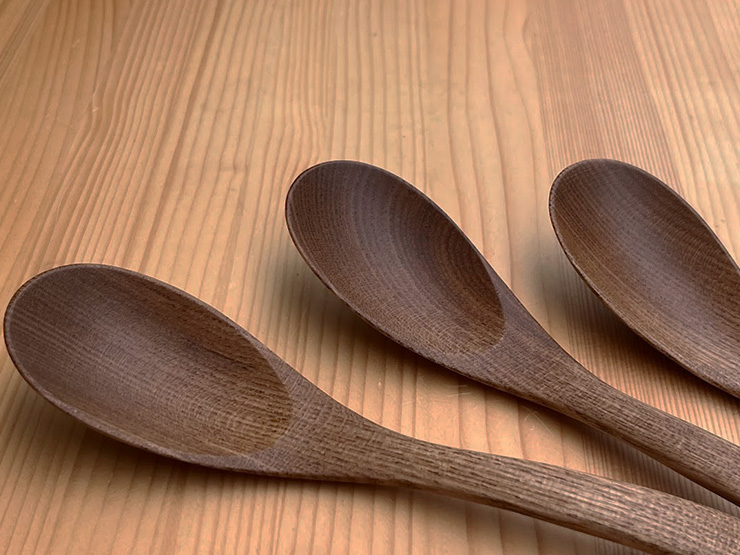 それまで工芸用品には不適とされた針葉樹を、その木目の美しさを生かしています。そこで生み出された作品を「オケクラフト」と呼んでおり、昭和58年から誕生したこの活動は現在20前後の工房があります。この活動の中核となったのは 「用の美」を追求したデザイナー故,秋岡芳夫氏。このスプーンの使いやすさも、秋岡氏の名前を聞いて納得でした。