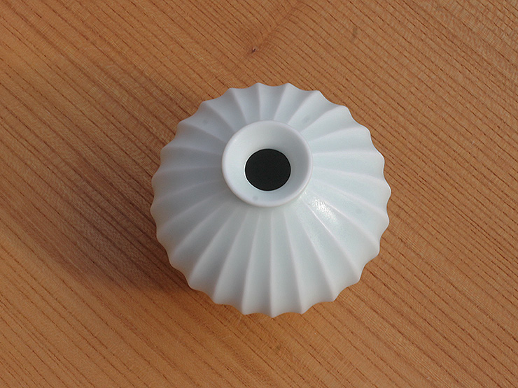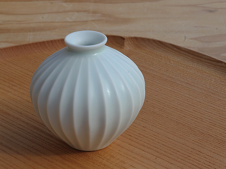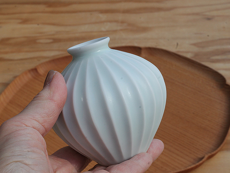 少し青みがかった生地でマットな仕上がりです。細く施されたしのぎが生地によくあって 繊細で優雅な雰囲気です。白のマットと比べると少し若々しい雰囲気があるかもしれません。首が短めでぷっくりとした胴体でとても愛嬌のある形です。【C】と【D】は同じ色で少し形が違います。【C】のほうが少し背が高くて真ん中より少しだけ高いところに膨らみがあります。