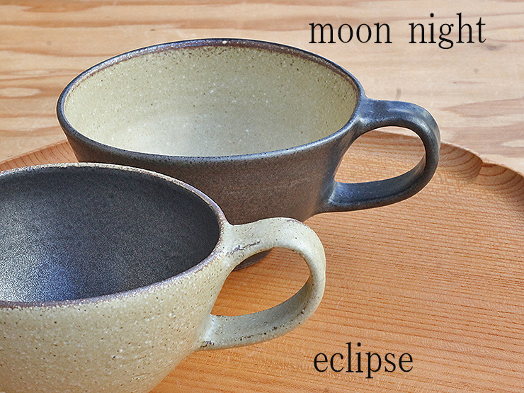 指がしっかりかかるサイズの持ち手、ほんの少しゆがんだような形と渋い色合いが醸し出す優しい雰囲気のカップです。手に取ると見た目より軽く感じるのは、色からくる重みを想像するからかもしれません。