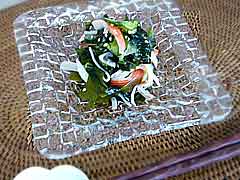 さてお料理ですが、これはもう本当に簡単で、ワカメときゅうりとカニ風味かまぼこを三杯酢であえて、ゴマを振っただけです(^^ゞ。簡単なお料理ばかりでお恥ずかしい限りです…。でもうつわが違うとなんだかいつもと違ったお料理に見えてなんだか感激です。この格子皿、本当に素敵でとても気に入ったので、今度は長い分も狙っています。お手軽多用皿も使い勝手がいいので買い足したいし、陶房青の角皿スープカップもいいなぁな~んて、もう欲しいものばかりで困ってしまいます。近いうちにまたどうぞよろしくお願い致します