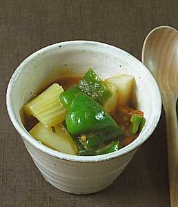 トマト・セロリ・ピーマン・玉ねぎなどなど冷蔵庫に少しずつ残った野菜でラタトゥユ風・・・・にしました。風邪気味だったので生姜もたっぷり。オリーブオイルでトマトからことこと炒めて水は全くいれずに仕上げると濃厚な野菜の味が出ていました。塩・胡椒・ローズマリー・タイム・オレガノ・マジョラムなどが粉末で混ざった「ハーブ塩胡椒」という調味料を最近愛用しているんですが、これと少しのトマトケチャップで仕上げました。お腹の中までスッキリしました。