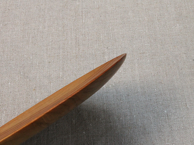 これは新鮮な 驚きでした。単一ではない木目が自然と文様になり趣のある仕上がりになるんですね。旋盤(せんばん)やろくろを使っていないので きれな正円ではなくあたたかみがあります。天ぷら・野菜炒め・パスタ・パンなど、どんどんお楽しみください。