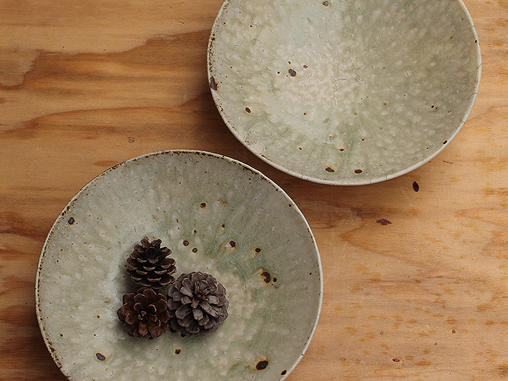 中村さんは同じ形・サイズで灰釉・粉引き・そしてこの淡緑、というように異なる釉薬で展開しています。