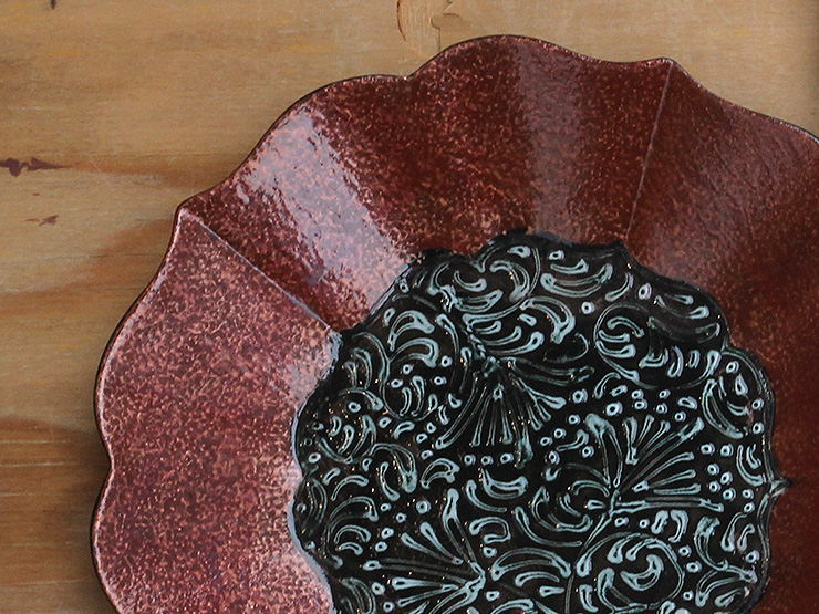 一瞬本当の金属の器かと思うような輝きと、細かい彫刻のような凹凸が独特の世界観を生み出しています。