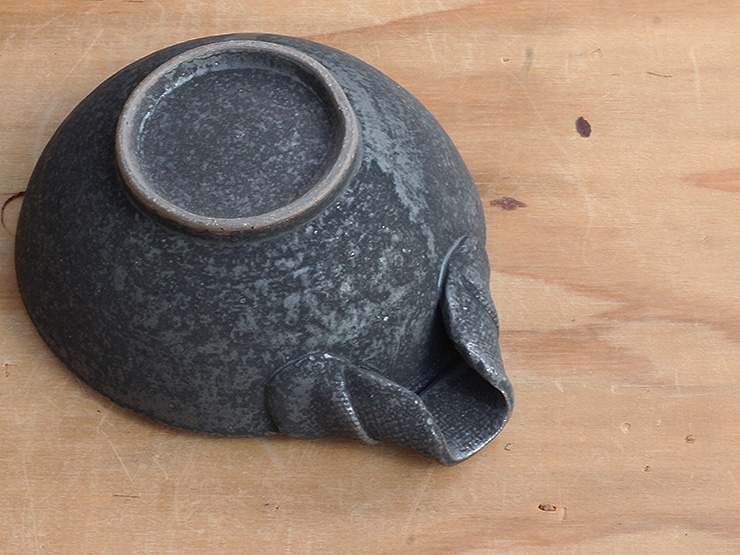 外側は触るとかさつくような乾いた感じで、水につけると一気に息を吹き返したような鮮やかな黒に見えますが、乾くとまたこの風合いになります。内側はつるっとしています。