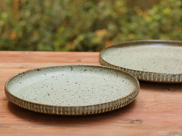 ほぼ平らな面に縁はすっきりと立ち上がりその部分だけに線文様が釉薬で施されていて触るとザリザリとしています。8寸はワンプレートととして小皿などと合わせて一人前を盛ってもいいですし、色々な盛り合わせにもぴったりですね。このオリーブに近い色合いですと渋い印象で和食を連想しますが、間違いなく赤とかオレンジがよく映えると思うのでトマトソースを使った料理などもぴったりだと思います。