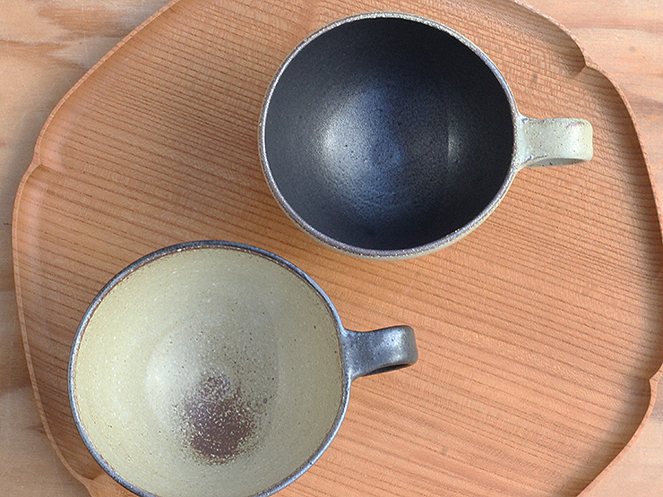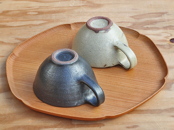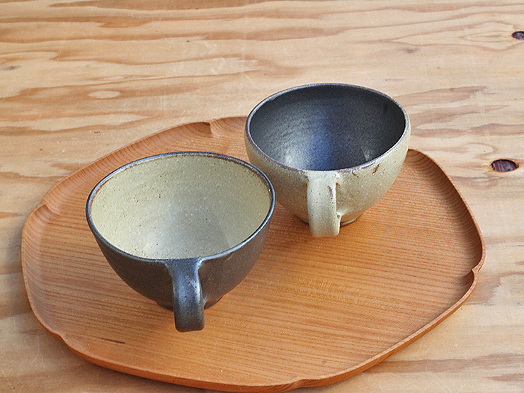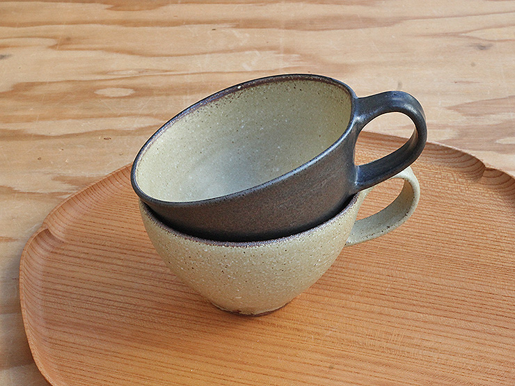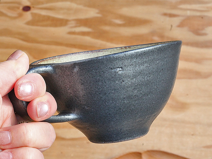 指がしっかりかかるサイズの持ち手、ほんの少しゆがんだような形と渋い色合いが醸し出す優しい雰囲気のカップです。手に取ると見た目より軽く感じるのは、色からくる重みを想像するからかもしれません。